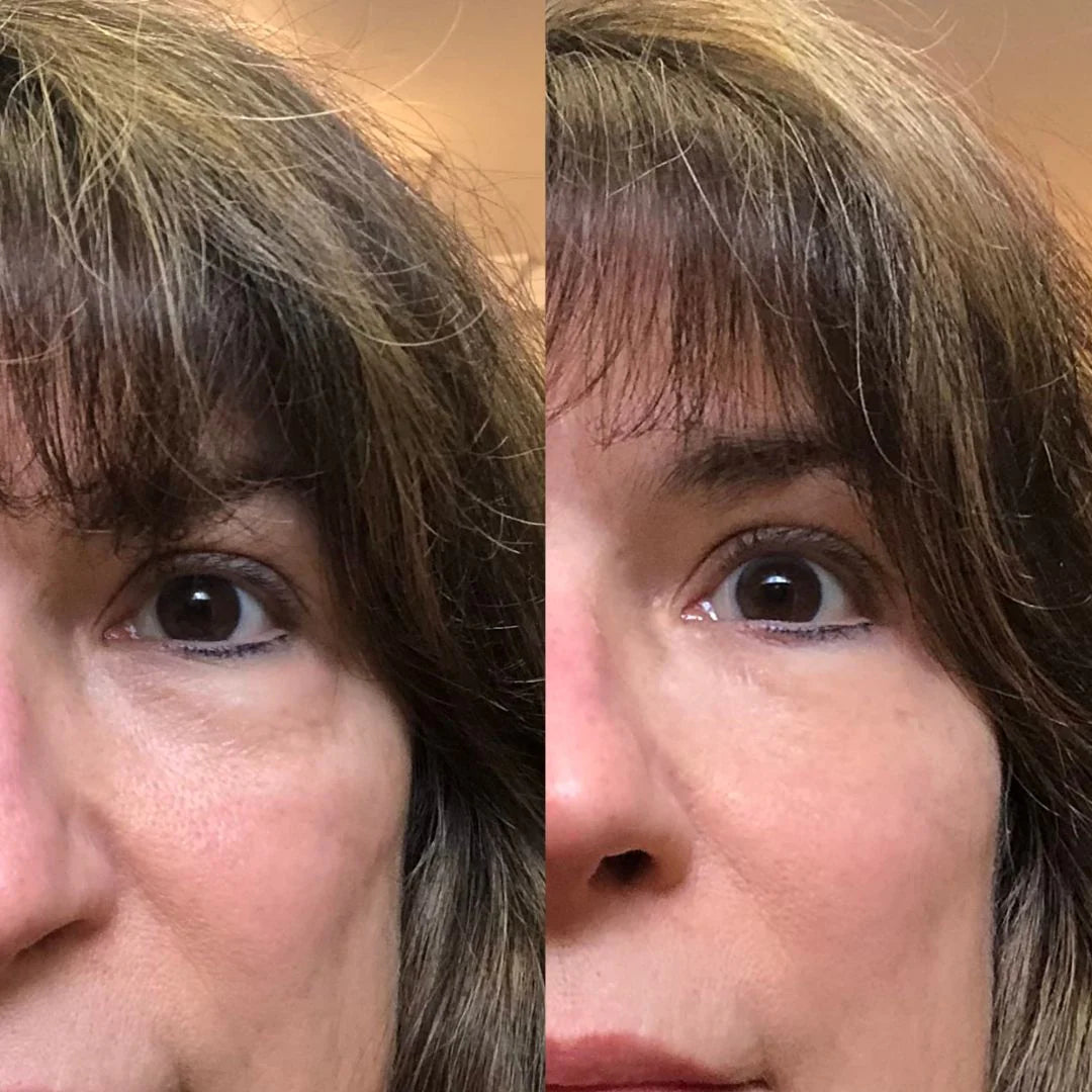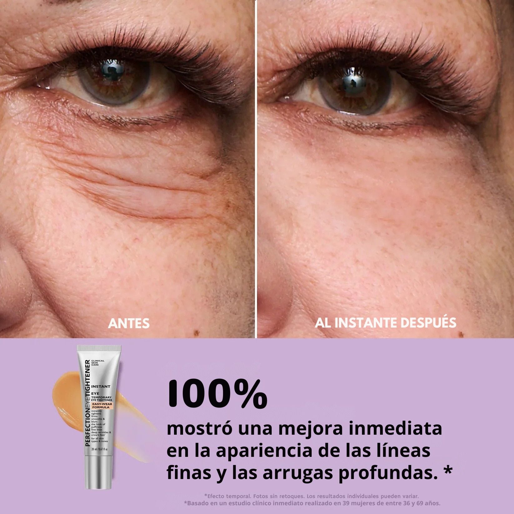 Clínicamente probado para reducir al instante las bolsas y la apariencia de las patas de gallo desde la primera aplicación.* Las fotos sin retoques de las participantes del estudio confirman la efectividad de este tensor de ojos de acción rápida, dejando el delicado contorno visiblemente más firme y renovado.