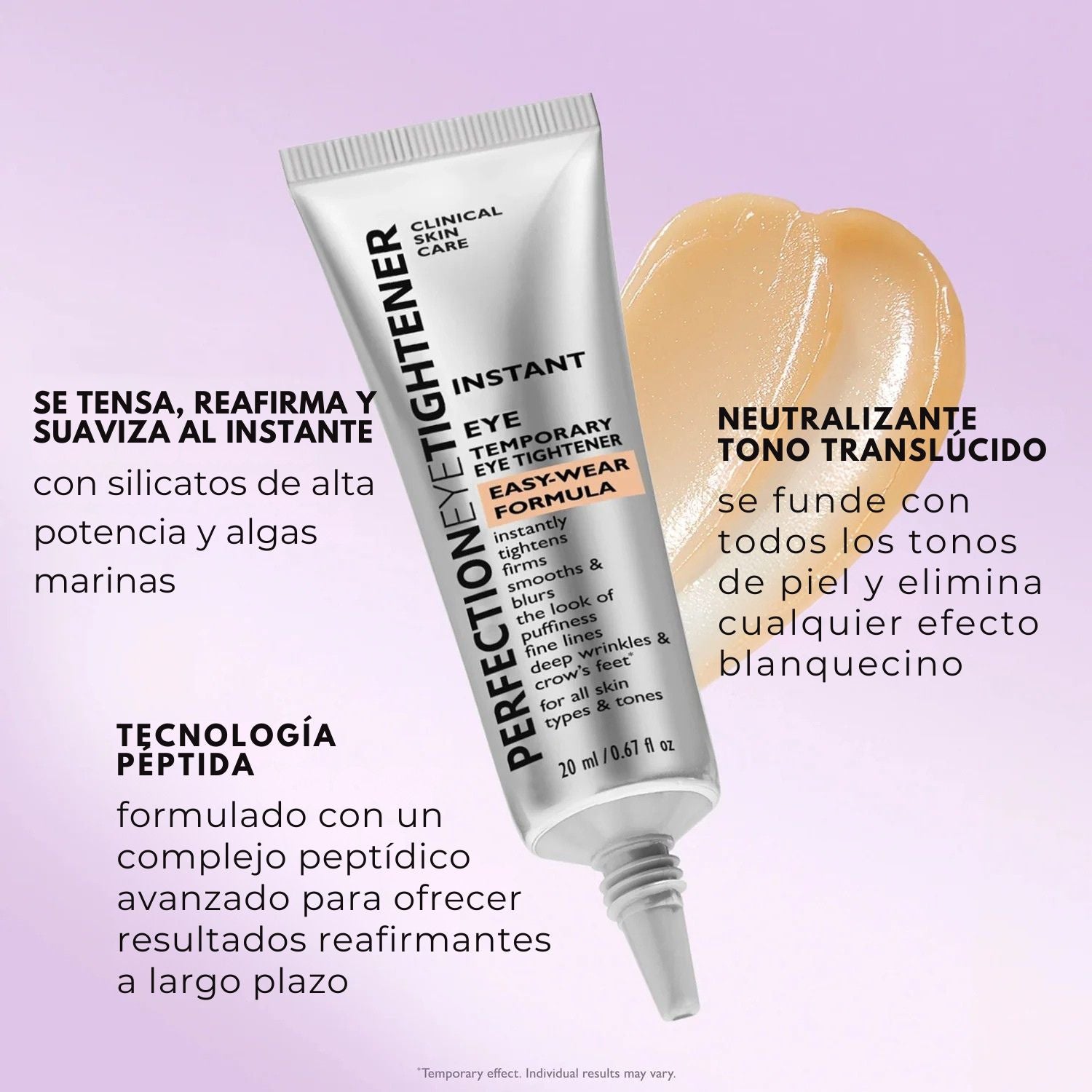 Este tensor instantáneo para el contorno de ojos es tu aliado para conseguir unos ojos visiblemente más firmes, lisos y juveniles en cuestión de minutos. Clínicamente probado para reducir bolsas, líneas finas, arrugas profundas y patas de gallo, combina la tecnología de acción rápida Firm-A-Tite™ con péptidos para ofrecer beneficios inmediatos y a largo plazo.